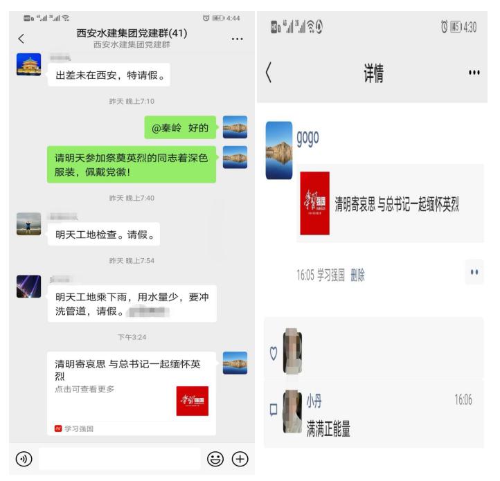 縷縷春風(fēng),綿綿細(xì)雨,說不及對(duì)革命烈士的無限深情,道不盡對(duì)烈士英魂的無盡哀思。在黨支部書記的宣傳呼吁下,公司職工紛紛參與了學(xué)習(xí)強(qiáng)國平臺(tái)關(guān)于清明寄哀思 與總書記一起緬懷英烈微信轉(zhuǎn)發(fā)活動(dòng),并在黨建學(xué)習(xí)群進(jìn)行了宣傳轉(zhuǎn)發(fā),自覺放平手機(jī),為英烈默哀一分鐘。